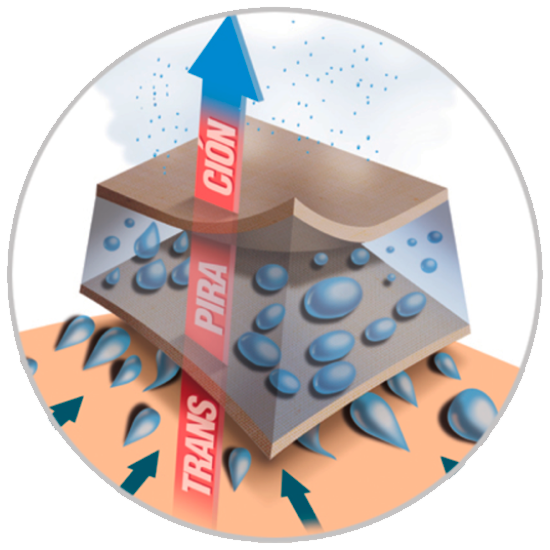 Está compuesta de 2 tejido que ligados entre sí, crean una cámara de aire que permite que el sudor se evapore completamente antes de que sea visible y mantiene la ropa y la piel seca en todo momento, además de aportar un efecto termo-regulador (mantiene la temperatura corporal).